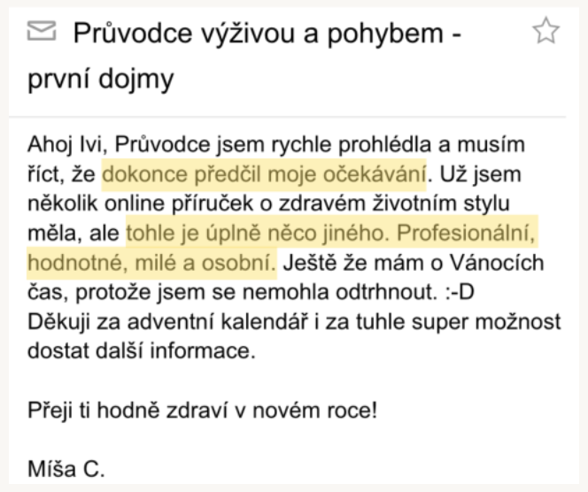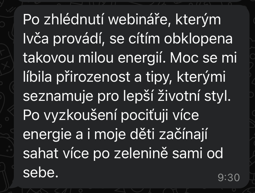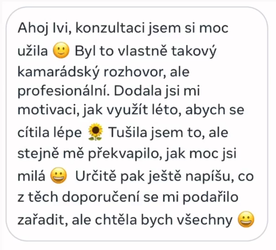 "Ivi, děkuji za workshop, bylo to pro mne takové prozření nikde jsem neslyšela takto kompletní doporučení, bez zákazů. U Tebe je to právě naopak a moje jídlo už nebude stejné jako doposud. Jsi neuvěřitelně pozitivní, že nemám pochyby že to zvadnu a už se těším na výsledky"